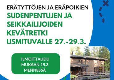 Erätyttöjen ja Eräpoikien sudenpentujen ja seikkailijoiden kevätretki järjestetään Usmituvalla Hyvinkäällä 27.-29.3.2026 Seikkailijat retkeilevät perjantaista sunnuntaihin ja sudenpennut lauantaista sunnuntaihin. Sudenpentujen retkimaksu on 20 € ja…