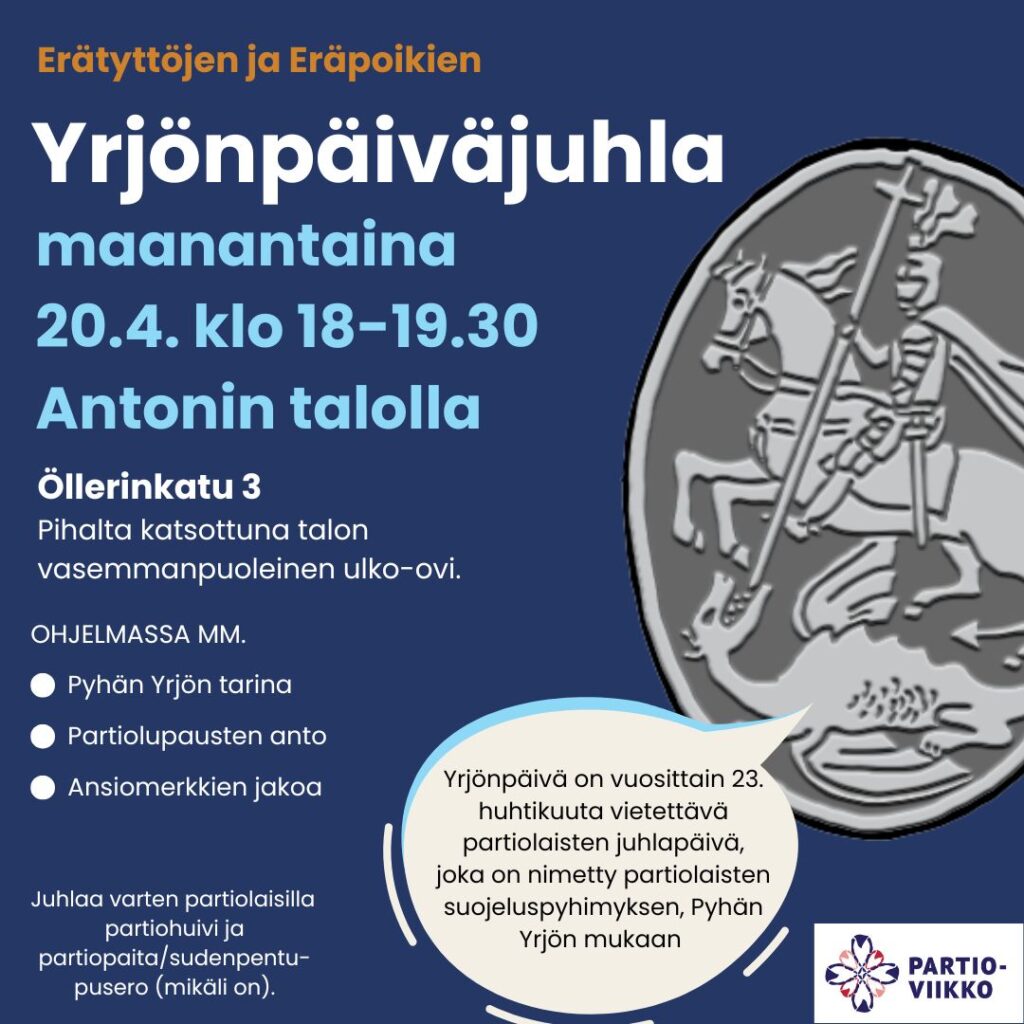 Erätyttöjen ja Eräpoikien yhteistä Yrjönpäiväjuhlaa vietetään maanantaina 20.4.2026 klo 18.00-19.30 Antonin talolla (vanha kaupunginmueo, Öllerinkatu 3).
