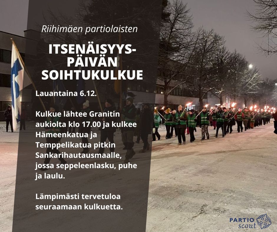Tervetuloa seuraamaan Riihimäen partiolaisten perinteistä Itsenäisyyspäivän soihtukulkuetta lauantaina 6.12. klo 17.00 alkaen. Kulkue lähtee Granitin aukioltya ja kulkee Hämeenkatua ja Temppelikatua pitkin Sankarihautausmaalle.